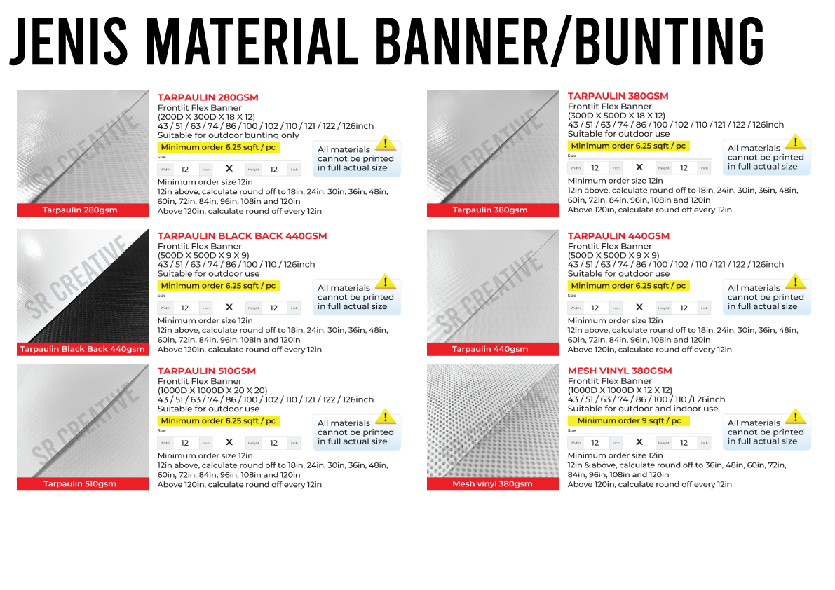 Masukkan jenis tarpaulin, saiz (dalam kaki) & kuantiti (pcs).